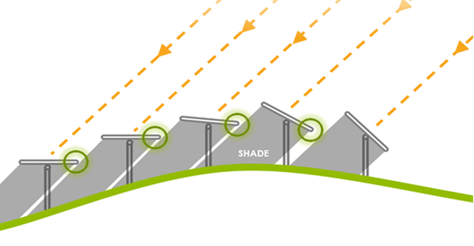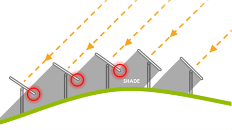 Shading is the biggest obstacle to harvesting sunlight, whether due to time of day or the terrain below. The sun’s daily path across the sky creates unavoidable issues. Sometimes its position is especially low and casting long shadows. This causes rows of panels to be eclipsed by those in front, greatly reducing their efficiency – especially on very flat sites where terracing is impossible.