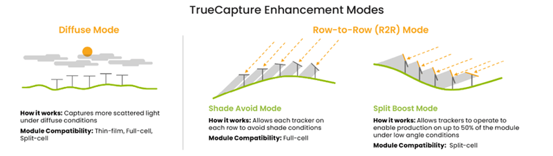 TrueCapture® leverages Nextracker’s proprietary technology to ensure the energy gain entitled by tracking is delivered for all the in-field conditions. Its advanced system considers small but important variations in terrain or rows of modules – something that was previously impossibly intricate. To further increase effectiveness, whatever the sun’s position, it integrates two key technologies: Diffuse Mode and Row-to-Row Backtracking (R2R).